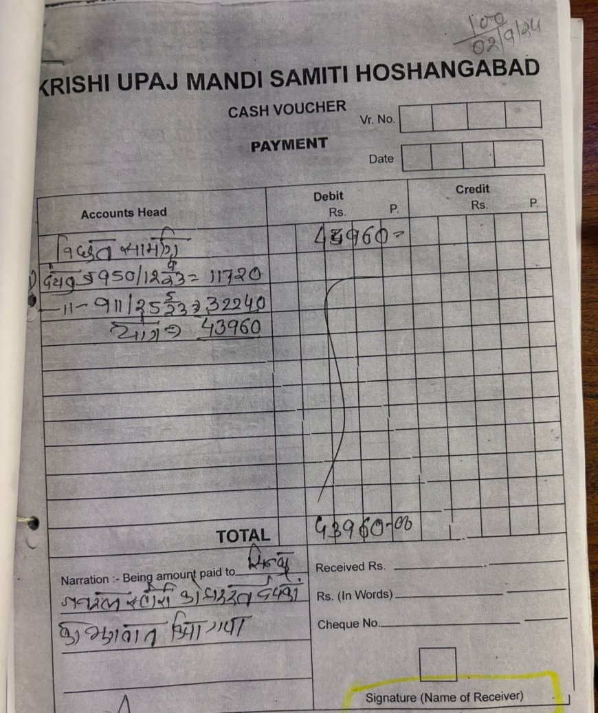 जी हाँ हम बात कर रहे हैं कृषि उपज मंडी नर्मदापुरम की जहाँ पर जिस बिल या बाउचर के माध्यम से पैसों का लेन देन किया गया है वह उन्होंने नियम अनुसार कम्पलीट नहीं किया है यहाँ तक कि बाउचर के प्रत्येक कॉलम ख़ाली छोड़ दिए गए हैं लेकिन जो काम का कॉलम है जहाँ राशि लिखना है वो ज़रूर लिखी है इससे साफ़ ज़ाहिर यह तो हो रहा है कि यहाँ पैसे की पकड़ है परंतु कागज़ी ज्ञान नहीं है इसलिए सारे नियम क़ानून को ताक में रखकर जमकर पैसा कमाया जा रहा है कृषि उपज मंडी समिति की पोल पट्टी की जानकारी के लिए निरंतर ख़बर को पढ़ते रहिए और हम भी निरंतर मंडी के फ़र्ज़ीवाड़े को उजागर करते रहेंगे हंड्रेड परसेंट सही और सबूत के साथ