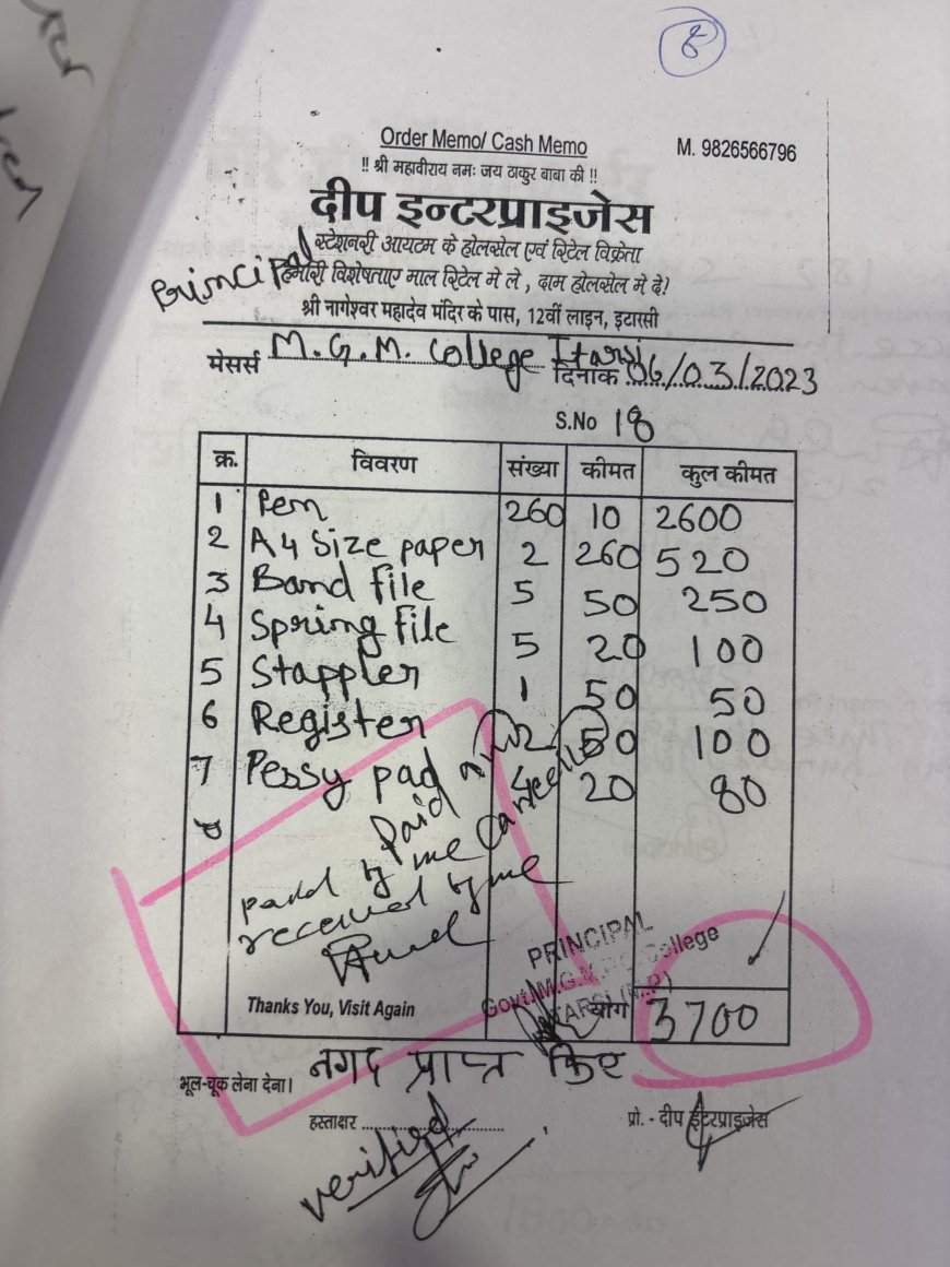 होशंगाबाद जिले (अब नर्मदापुरम) के प्रतिष्ठित महात्मा गांधी इस स्नातकोत्तर महाविद्यालय(MGM) कॉलेज, इटारसी में वित्तीय नियमों की अनदेखी कर लाखों रुपये का अनियमित भुगतान किए जाने का सनसनीखेज मामला सामने आया है। सूचना के अधिकार से मिली जानकारी के अनुसार, कॉलेज प्रशासन ने कई आवश्यक और गैर-आवश्यक मदों पर हुए खर्चों को 'Paid by Me' या 'Self-paid' के नाम पर पास कर दिया, जबकि सरकारी खरीद और भुगतान के नियमों के तहत ऐसा करना पूरी तरह से नियम विरुद्ध है और गंभीर वित्तीय अनियमितता की श्रेणी में आता है। लेकिन प्राचार्य और एकाउंटेंट की मिलीभगत से लाखों रुपया के बिल प्रतिमाह भुगतान किए गए हैं योगी अनियमितता के साथ ग़बन के दायरे में भी आते हैं क्योंकि ऐसे एक बिल नहीं है हज़ारों बिल है जिसका भुगतान नियम विरुद्ध हुआ है